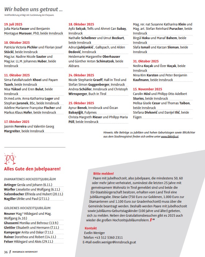 Trauungen Juli/Oktober/November 2025 erschienen in der "Innsbruck informiert"-Ausgabe Dezember 2025