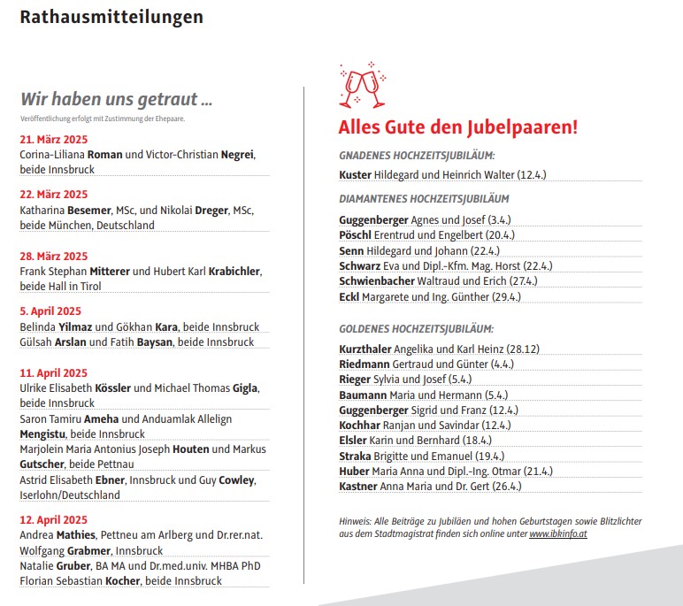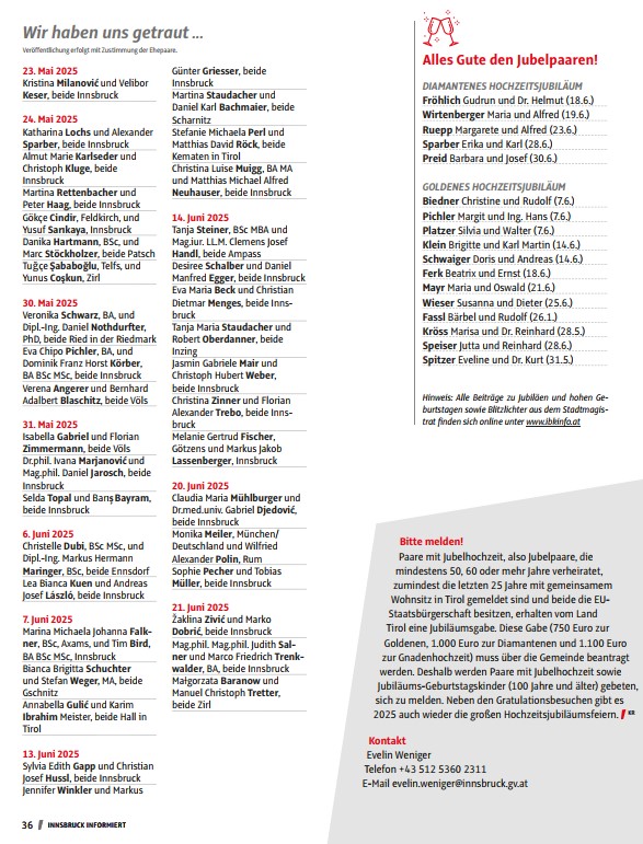 Trauungen April/Mai 2025 erschienen in der "Innsbruck informiert"-Ausgabe Juni 2025